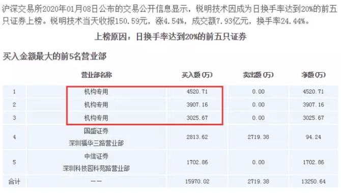 最典型的案例当属锐明技术,周三的龙虎榜显示买一、买二、买三均是机构席位,累计买入金额超过1亿。