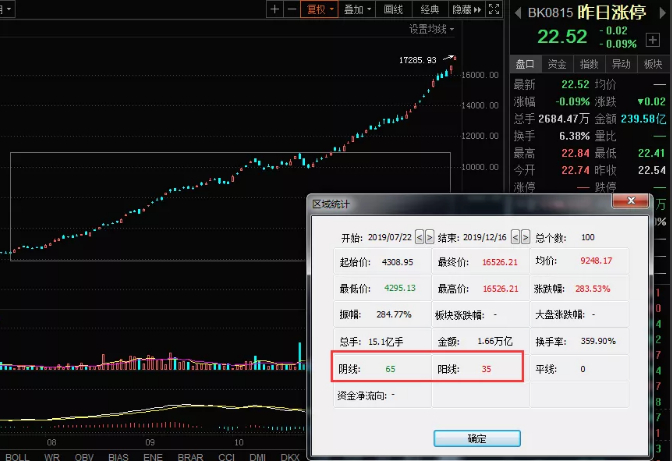 我们再量化一点去分析,A股有一个叫做“昨日涨停”的指数,这个指数的成分股是前一天所有涨停(非一字、非ST)的股票,然后计算第二天的平均涨幅。我随意选取了这个指数连续100个交易日的走势,在这100个交易日里,有65根阴线,35根阴线。