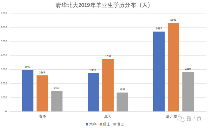 按学历层次来看,清华北大2019年毕业生中,硕士毕业生最多,达到6297人,占比42.51%;本科毕业生5697人,占比38.46%;博士1467人,占比19.03%。