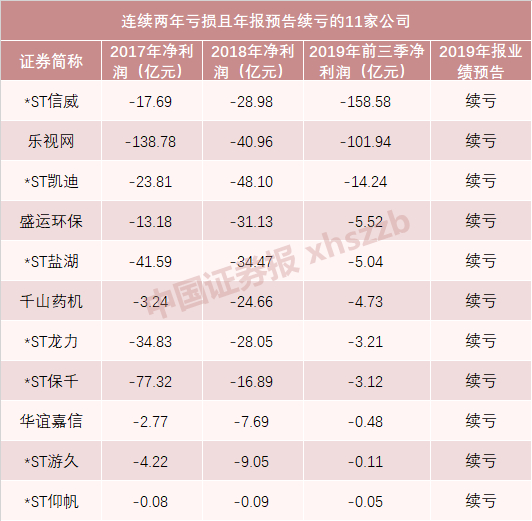 wind数据显示,此前连续两年亏损且2019年年报预告续亏的个股,目前共有11只,包括7只*ST股票和4只创业板股票。这意味着,它们存在显著的退市风险。