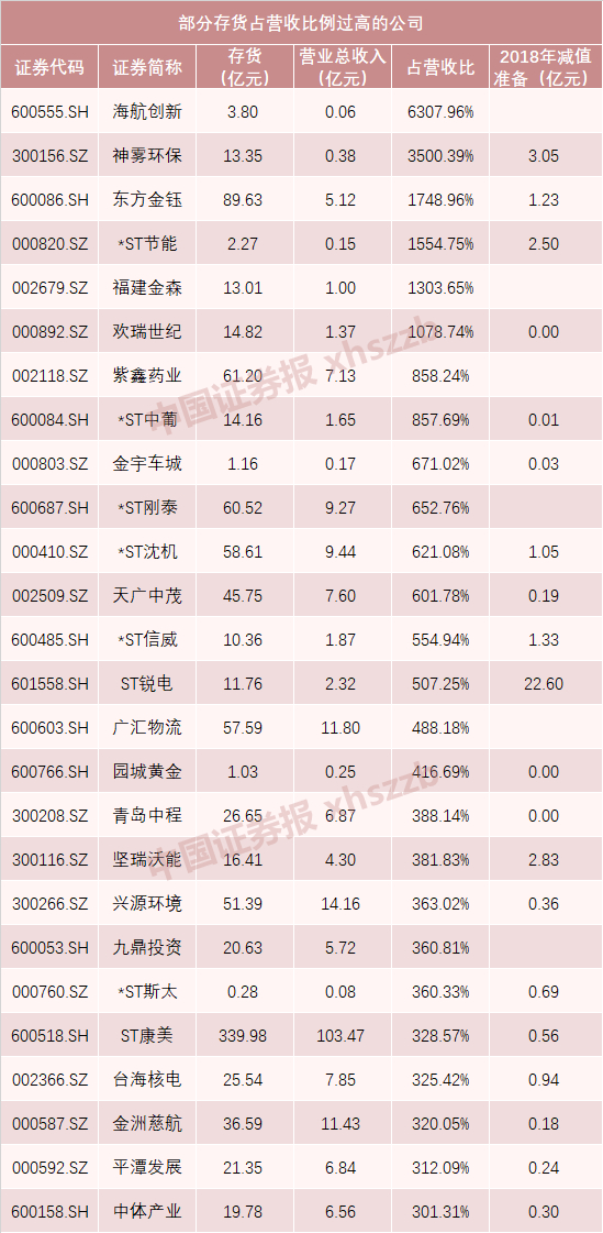 海航创新、神雾环保、东方金钰、*ST节能、福建金森、欢瑞世纪等6家公司的占比超过了10倍。这意味着,按照现在的销售情况,这些企业即便不再生产,也需要10年时间来消化存货。