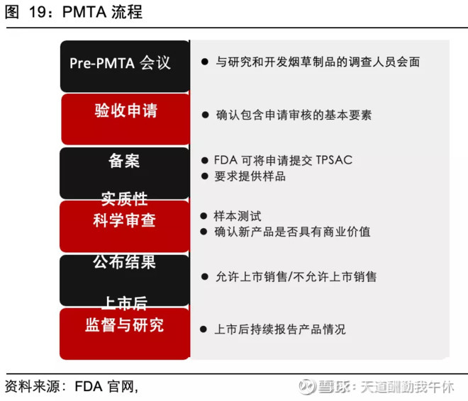 2016年美国FDA新规将电子烟纳入烟 草制品进行监管,并在2017 年出台新规,要求 2017 年 2 月后上市的蒸汽烟若必须进 行 PMTA(烟草产品市场准入申请)认证,否则禁止上市;2017 年前上市的电子烟虽可 销售,但必须在2020年5月前进行PMTA申请.