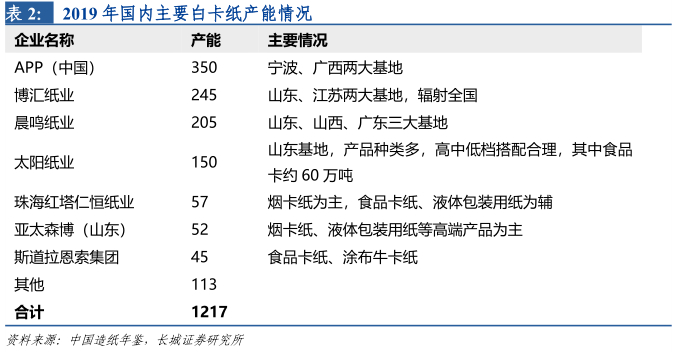 投资建议:APP并购博汇令白卡纸行业走向寡头垄断,预计白卡纸行业由于产能投放冲击带来的强烈周期波动将被抚平;需求端废纸缺口可能带来的白板纸产能加速退出,白卡纸需求向好,长期看盈利稳定性有望显著提升。建议关注【太阳纸业】:文化纸盈利水平20年有望维持高位;箱板纸原材料自给率高具有成本优势;集团具有150万吨白卡纸产能,其中60万吨为食品卡纸将受益于限塑趋势。同时关注【博汇纸业】、【晨鸣纸业】。