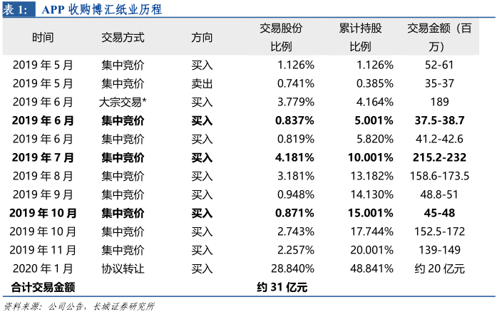 博汇实控人拟转让全部股权,交易完成后APP将成控股股东。2020年1月2日,博汇纸业公告称,公司实控人杨延良先生及其配偶李秀荣女士已于2019年12月30日与金光纸业(中国)投资有限公司签署《股权转让意向书》,拟将其持有的博汇集团100%股权转让予金光纸业。2020年1月6日,《股权转让协议》签署完成,APP对博汇纸业合计持股比例将达到48.84%,博汇纸业实控人将变更为黄志源先生及其家族成员。此次转让触发要约收购,金光纸业将以5.36元/股的价格对博汇纸业剩余51.16%股份发起收购要约。