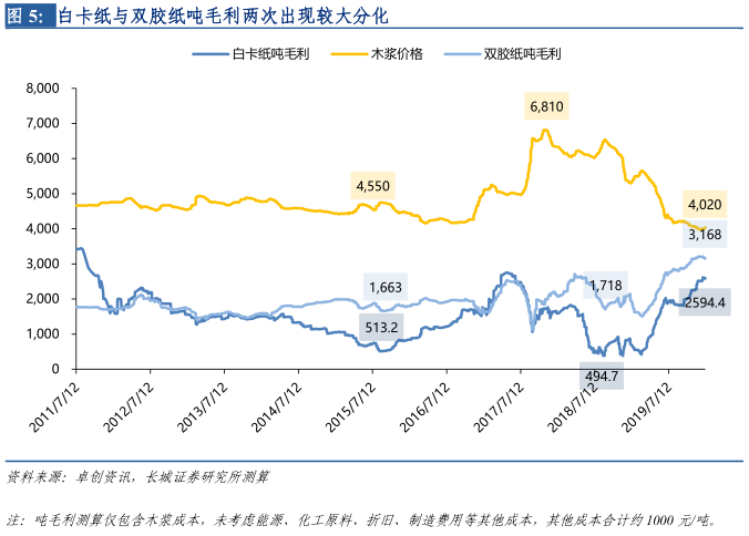 除了产能过剩这个主要因素之外,白卡纸需求与原材料的波动周期可能错配,增加价格传导的难度。白卡纸的原材料主要为木浆(包括漂阔浆和化机浆),因此成本上的波动与木浆系的文化纸相似。但白卡纸作为包装用纸,其下游需求的变化趋势与箱板瓦楞纸等废纸系纸品相似。2017-2018年木浆供给端受自然风险和意外事故影响供应不足,而下游文化纸及生活用纸需求相对稳定,木浆供需失衡,价格大幅上涨。而白卡需求受经济环境影响要大于文化纸,在此轮木浆上涨的行情中提价难度高于双胶纸。叠加头部纸企价格战因素,白卡纸与双胶纸的吨毛利再次出现较大分化,白卡吨毛利跌至历史低位。