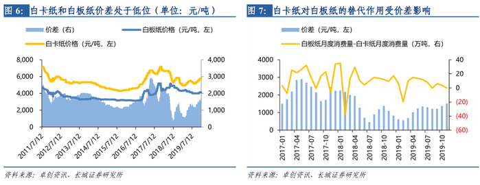 APP和博汇纸业是目前国内白卡纸产能最大的两家纸企,而博汇也是规划白卡纸产能最多的企业。获得博汇控制权后,APP在白卡纸市场的份额接近50%,对行业供给端有更强的控制能力,未来产能投放节奏预计将趋于平稳。另外,白卡纸对白板纸的替代作用在短期内受价差影响比较明显。当前白卡-白板价价差虽然有所回升,但仍处于较低的水平,白卡对白板的替代效应较强。预计今年木浆价格维持低位而废纸价格将上涨并出现原材料缺口,白板纸压力较大或将加速出清,白卡纸需求确定性相对较强,吨毛利仍有上行空间。