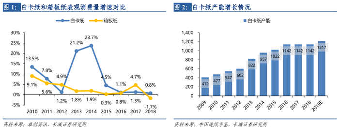 产能严重过剩为主要原因,价格传导不顺加剧波动。根据卓创资讯,2018年白卡纸产能利用率仅有67%,属于产能过剩较为严重的纸种,而白卡纸相对较小的市场规模使其价格对需求变化非常敏感。2018年白卡纸的表观消费量为655万吨,而箱板纸表观消费量为2677万吨,白卡纸市场规模仅为箱板纸的1/4。此外,白卡纸行业集中度较高,大企业多但尚未形成寡头垄断的格局,而是更接近垄断竞争市场。大型纸企单次产能投放通常在百万吨级别,对于体量并不大的白卡纸市场来说是很大的冲击。一旦发生2013-2014期间产能集中投放的情形,市场就很容易陷入恶性竞争中,损害纸企盈利能力。2014-2015年中白卡纸吨毛利与双胶纸吨毛利出现分化的原因主要是产能集中投放带来的恶性竞争,这段时间白卡纸吨成本已高于售价。部分大型纸企(如万国太阳)也处于亏损销售的状态。