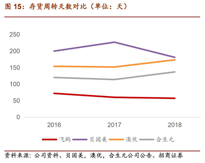 库存周转快于同行,注重上架产品新鲜度。飞鹤实行新的销售政策,要求线下产品必须尽量在生产日期的6个月内售出,以此保证市面上飞鹤奶粉的新鲜度。而对于电商渠道,自营网上商店订单从工厂到送货到家只需28天。反映到财务上,飞鹤存货周转速度是内资龙头品牌中最快的,存货周转天数最近三年不断下降,2018年仅有57天。