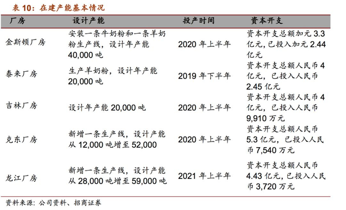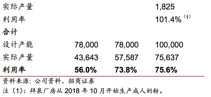 在建工厂满足未来生产需要,投产后公司设计产能翻倍增长。2018年,甘南厂房、龙江厂房、飞鹤镇赉厂房设计产能均有扩张,但是近两年业务快速扩张,整体产能利用率从2016年的56.0%增长至2018年的75.6%。目前公司新建金斯顿厂房、泰来厂房、吉林厂房,并扩建克东厂房和龙江厂房,所有厂房投产后,公司设计产能将提升至243,800吨。