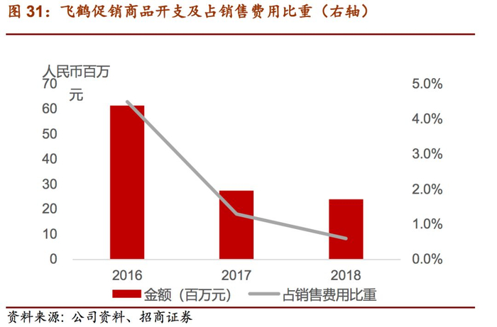 通过公众号和一站式平台关联“母婴”概念,依靠品牌力带动销售增长。公众号星妈会目前拥有600-700万会员,每周推送一篇定制文章。公司还在着手建立孕妇和宝宝的一站式平台,寻找月子中心、体检诊所、婴儿游泳中心、美容院、早教中心等领域的领先品牌合作,互相引流。飞鹤希望销售的增长是依靠品牌力的带动,过去几年不断减少促销力度,销售收入大幅增长的同时,销售费用中的促销商品开支却从2016年的人民币6,142万元下降到2018年的人民币2,411万元,目前在销售费用中的比重不到1%。