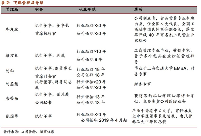 管理团队经验丰富,带领公司完成前瞻性布局。公司核心管理层均在奶粉行业从业超过10年,并拥有长远的战略眼光与优秀的执行力,在产业链布局、渠道推广、品牌定位上均先人一步,带领飞鹤成为中国市场第一国产奶粉品牌。