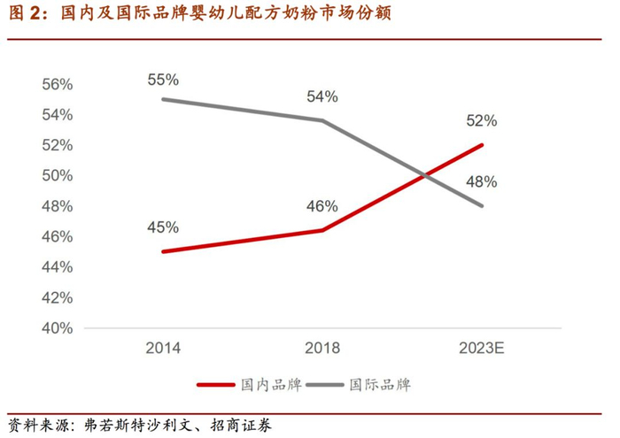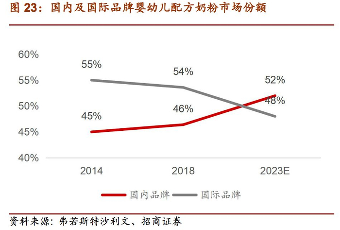着力产品研发及品牌推广,内资品牌市场份额逐步反弹。2008年食品安全事件已过去十余年,消费者对国产婴幼儿配方奶粉的不信任逐渐消除。同时,通过持续投资于品牌推广,并大力研发更高端的产品,内资品牌势能快速提升,挑战外资品牌霸主地位。根据弗若斯特沙利文,2014年-2018年,内资品牌的市场份额从45%上升至46.6%,且预计2023年将上升至52%。从份额来看,内资品牌已经可以和外资分庭抗礼,在未来的竞争中更是具有多重优势。