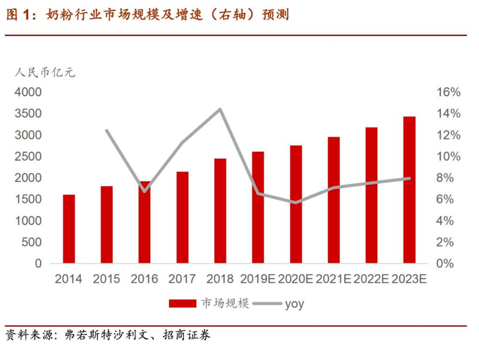 人口增长不确定性增强,行业或步入成长后期,量缓价升。消费量方面,首先,新出生人口增长有一定压力。“全面开放二孩”政策短暂刺激了人口生育,但是预期中的“人口小高峰”并没有到来。而受“独生子女”政策的影响,我国育龄妇女人口出现了显著的下滑。同时,90后作为婚育主力,在赡养老人、偿还房贷等多重压力下,生育意愿下降,晚婚晚育甚至丁克成为普遍现象。其次,相对于辅食和母乳,人均奶粉消费量的提升空间或有限。母乳喂养有助于宝宝吸收营养、提升免疫力,并能够帮助妈妈产后修复。目前,世界卫生组织和国家卫计委大力倡导母乳喂养,进行“母乳比奶粉更适合宝宝发育成长”的消费者教育。与此同时,众多品牌也会在官网上首先弹出“倡导母乳喂养”的宣传。价格方面,我国奶粉价格相对于本国人均可支配收入水平已处于高位,但短期内高端化仍在进行。从绝对价格上来看,国内奶粉平均零售价格已经远高于美日英,略高于香港;从相对价格来看,目前我国奶粉售价相对于本国人均可支配收入已经处于世界最高水平。但短期内,由于消费端(家长心态和非理性消费)、供给端(厂商诉求)、渠道端(短期内仍然较为分散和不透明),我们判断奶粉仍然有价格推升空间(包括产品结构升级),长期价格中枢暂时难下定论,我们认为与政策、消费者心态变化等均有关系。根据弗若斯特沙利文预测,未来五年复合增速约6.9%,其中量增速逐步放缓,价格增速保持在3.0%左右。