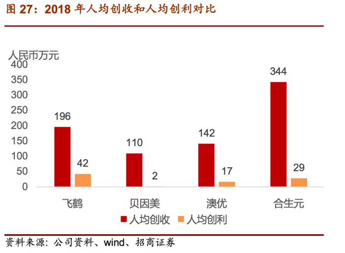 优秀管理层的带领下,人均创收和人均创利均位于行业前列。公司核心管理层均有10年以上从业经验,眼光长远,执行力强。截止2019年6月30日,飞鹤共有5,422名员工,其中销售及营销人员3,130人。与同行业其他公司对比,飞鹤2018年人均年创收人民币196万元,高于同样以奶粉为单一主业的贝因美和澳优。其中,合生元人均创收高达人民币344万元,或因合生元除了奶粉业务同时也经营保健品业务。同时,飞鹤2018年人均创利人民币42万元,在可比公司中最多。