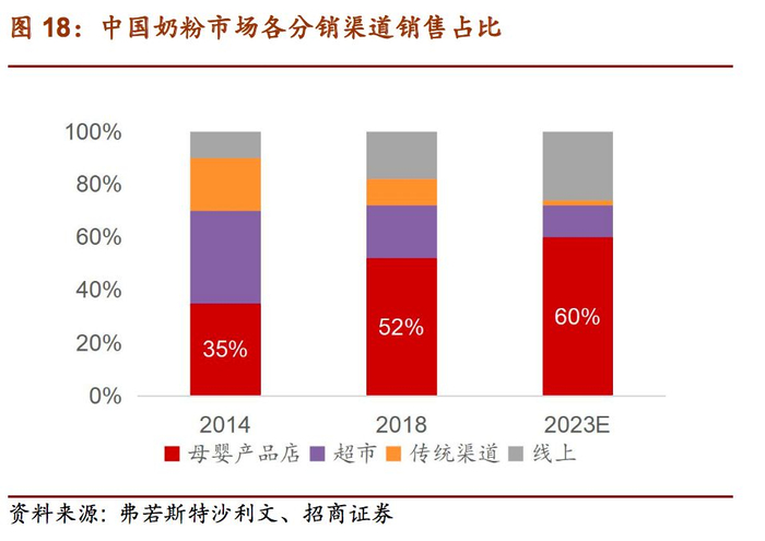 系统性布局母婴零售渠道,重要性愈发凸显。母婴店作为专业的零售渠道,更容易获得消费者信任,也能通过更加精准的市场教育为品牌做推广。中国市场母婴渠道的份额占比不断提升,2018年已经达到52%,成为各奶粉品牌必争之地。而飞鹤在母婴渠道抢占先机,2010年起即与孩子王、爱婴岛、婴贝儿等主要母婴商品店建立合作关系,设立客户服务部门。2018年,公司零售渠道贡献收入人民币16.5亿元(主要是母婴渠道),同比增长67%,网点数目扩张迅速。