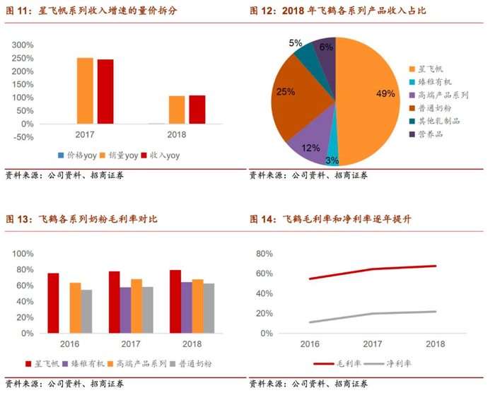大单品模式,星飞帆高增助力飞鹤实现量价齐升。2017/2018年,星飞帆产品收入分别增长245%和108%,价格基本没有变动,主要是销量增长的贡献,同比增长251%和107%。星飞帆销售占公司总体入比例也从2016年的19%提升至49%,实现了公司产品结构从中低端向高端和超高端的转变。此外,星飞帆产品毛利率高达75%以上,在公司所有系列中最高,高端产品销售占比的提升也带动了公司毛利率和净利率的逐年提升。