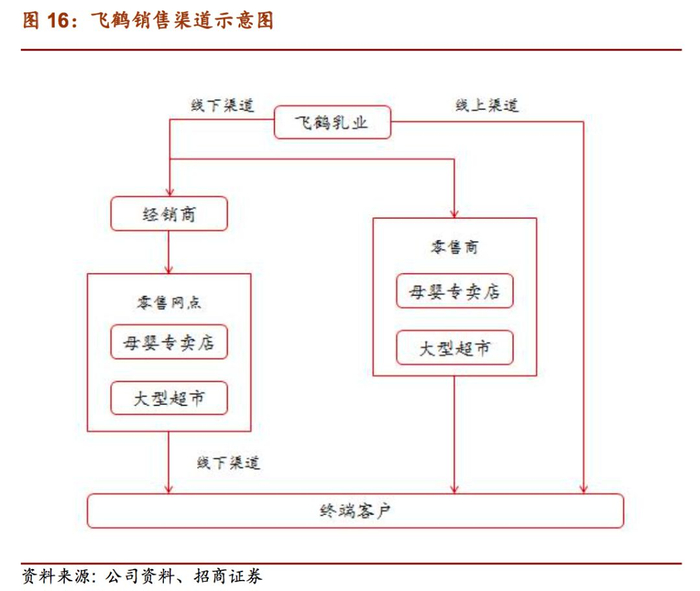 2013-2015年:扁平化渠道,加强产品研发与国际合作。公司积极推进单层次分销系统,较早认识到母婴渠道的重要性并积极开拓零售渠道。2014年,飞鹤联合哈佛大学医学院成立飞鹤营养实验室,从事营养研究及教学活动。2016年公司成立Canada Royal Milk,配合金斯顿厂房的牛奶及羊奶生产,为开拓国际市场做准备。