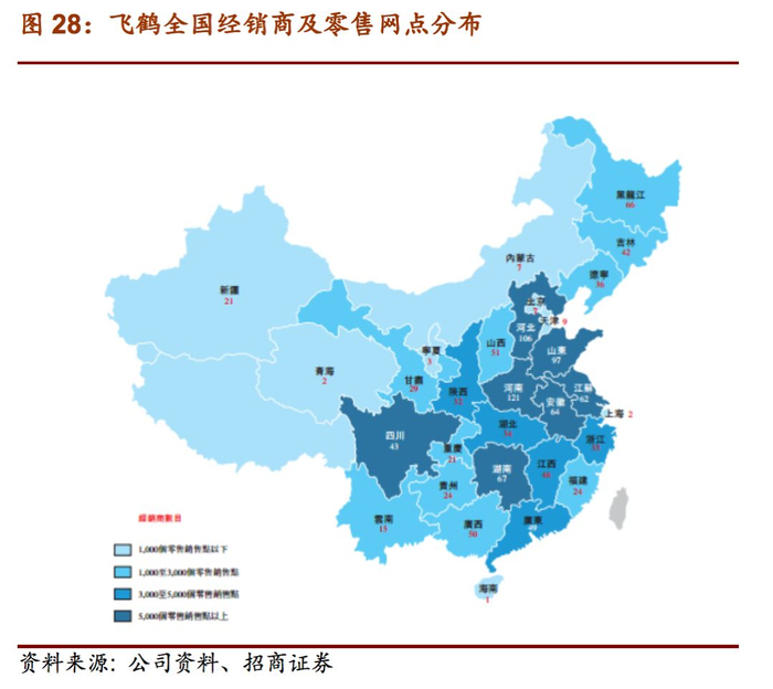 发力一二线城市及华南地区,增强弱势市场市占率。从下图经销商及零售网点的分布可以看出,公司的强势市场集中在华中、华北和东北地区,尤其是河南、河北、山东、安徽、四川、湖南等省份。公司在低线城市保持领先的市场地位,但是一线、新一线等城市依然由外资品牌主导,拿下这些城市是飞鹤成为真正一线品牌的必经之路。飞鹤通过宣传“更适合中国宝宝体质”和“更新鲜”与外资品牌PK,同时加大线下推广活动,与终端门店合作持续转化外资品牌的消费者。