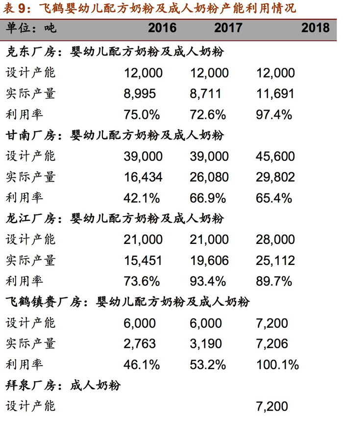 现有产能利用率随业务扩张逐步提高。公司目前拥有五个生产工厂,高端婴幼儿配方奶粉的主要生产设施位于甘南和龙江厂房,随着星飞帆系列产品的需求上涨,两家工厂实际产量整体上涨。飞鹤镇赉厂房由于2018年优化生产分配,产能利用率高达100.1%。克东厂房负责生产婴幼儿配方奶粉产品及液态奶产品,拜泉厂房负责生产成人奶粉,2018年产能利用率分别为97.4%和101.4%。