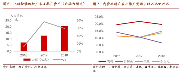 加大营销投入,抢占消费者心智。内资品牌纷纷模仿“更适合中国宝宝体质”的定位,飞鹤则不断加投营销费用,通过大声量传播抢占消费者心智。2016-2018年,公司广告及推广投入分别高达人民币7.2亿元/12.7亿元/20.3亿元,占收入比例维持在20%左右,不管是绝对金额还是收入占比都远高于其他内资品牌。除了在央视、分众等平台上投放广告外,飞鹤还与王牌电视节目《快乐大本营》合作,并聘请章子怡作为形象大使。章子怡专业、敬业、追求卓越的个人形象有利于飞鹤打造高端奶粉形象。