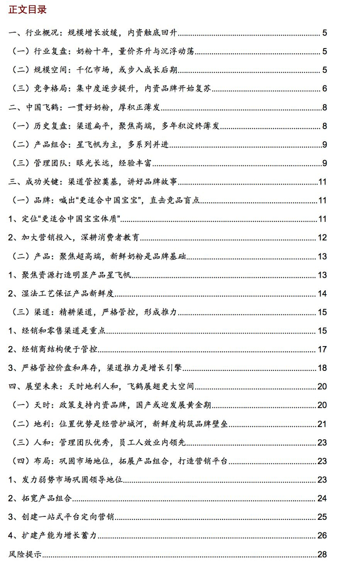 奶粉行业步入成长后期,注册制推动下市场集中度提升,内资品牌份额触底回升,而飞鹤则成为带领内资奶粉突围的领头羊。严格的渠道管控是飞鹤“厚积”之发展基石,而抓住“更适合”“更新鲜”的独特品牌故事,大规模空中地面品牌投入,强化消费者沟通,是飞鹤“薄发”之支点。展望未来,飞鹤占据天时地利人和,渠道推力和品牌张力均将助力飞鹤快速、可持续的发展。