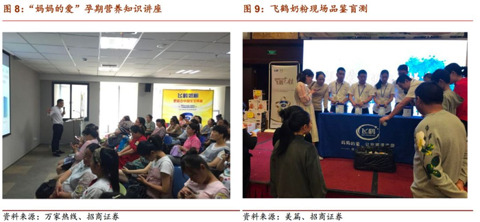 多种方式深耕消费者教育,尤其注重线下面对面活动。除了线上做广告宣传,公司尤其注重线下与消费者面对面的交流,以增强品牌认知和粘性。2018年飞鹤在全国举办超过30万场线下活动,包括“妈妈的爱”研讨会、嘉年华和迷你秀。其中,“妈妈的爱”是公司免费提供怀孕和育儿方面知识的面对面活动,2018年全国举办5,500多场,参加者超过60万人。从财务数据看,2016-2018年公司销售费用中的线下活动开支分别为人民币2.3亿元/4.4亿元/8.6亿元,占销售费用的比例从17.0%提升至23.6%,成为销售费用的重要组成部分。
