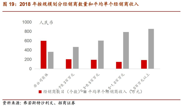经销渠道贡献公司大部分销售。虽然近两年因为电商业务发展,经销渠道收入占比有所下降,但截止2018年仍占比72%。目前公司经销商数目稳定在1,100家左右,但是近两年零售网点数目和平均单个网点收入都均快速增长,推动经销渠道连续两年实现55%以上的增速。