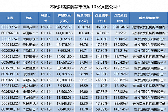 解禁市值超过10亿元的上市公司合计有15家,除中油资本外,中国中车解禁市值也超过100亿元,此外,还有欧普康视(300595.SZ)、华林证券(002945.SZ)、泛微网络(603039.SH)三家公司解禁市值超过50亿元。