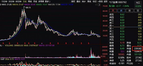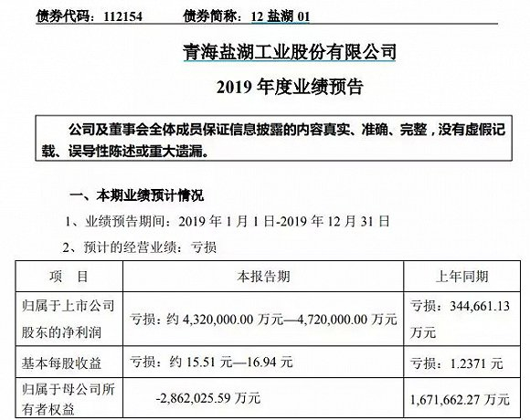 据*ST盐湖公告,预计公司2019年全年亏损约为432亿元-472亿元。这么一笔巨大的亏损是什么概念?目前*ST盐湖总市值约239亿,相当于一下亏掉了2个总市值。