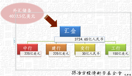 不是财政的钱,不能拿出用。那它怎么能变成汇金公司的资本金呢?财政部向人民银行发特别国债,财政部拿到人民币以后,再去买人民银行的外汇,拿外汇作为资本金注资到中央汇金公司。中央汇金公司作为国务院直接领导的金融控股公司再向工、农、中、建行注资。我这里只讲外汇,不讲银行改革。汇金公司作为股权投资推了金融改革和银行改制上市,具体怎么注资我就不展开了。