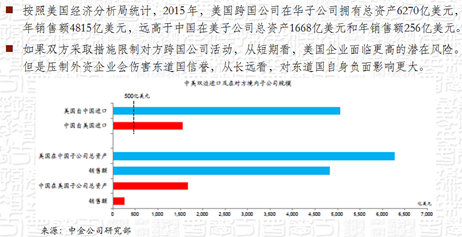 中美贸易摩擦还在进行中,特朗普翻脸比我翻PPT都快,情况每天都在变。如果按照目前这样中美互相加征关税,使中美之间的关税水平恢复到WTO之前,大家可以想想这是什么概念。现在美国在华投资远大于中国在美投资,美国在华利益更多,我们一直说“斗则两伤,合则两利”,我们并不希望贸易摩擦继续搞下去。