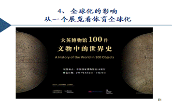 体育产业也是一个高度全球化的产业。这是去年国家博物馆一次非常有名的展览,是由大英博物馆挑选了100件产品来中国展出。它的主题是“文物中的世界史”,从文物来看全球交往是怎么发生的。最后的第100件产品很有意思,就是一件球衣,标题是“一件球衣连接各大洲”。