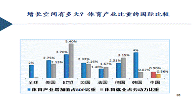 蓝色是一些国家体育产业占GDP比重,体育就业占劳动力就业比重是灰色,这是美国、欧盟、英国、法国、德国、韩国挑了一些数据来看一下,这些国家的数据相对可靠一些。无论产值占GDP比重,还是就业占劳动就业的比重,明显我们都是很低的。这是2016年的数据,现在发展还是比较滞后。