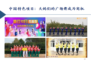 还有一个非常有中国特色的项目,已经成为商机了,这就是广场舞。现在有六个网站可以对广场舞进行商业化运营。一个特点是,在这些平台上,会同步有几百个不同的广场舞在教你,你想要什么舞它有什么舞。另一个特点是可以上传广场舞。如果你觉得你的团队跳的好,你可以把自己的舞传上去,经过审核后就可以发表,展示给更多的人观看学习,所以非常受大妈们的欢迎。另外它还经常举行现场比赛,直接上传视频给大家看。广场舞能成为商机,绝对是中国特色,有一亿多人在跳,还有一亿多人在看。虽然变现程度很低,大概最好的网站人均不到几块钱,但是它的量很大,基本就是买卖一些舞衣、舞鞋、道具、音响之类的项目。