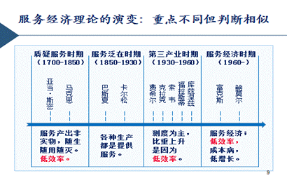 在经济理论中间,服务经济理论早期属于一个比较边远的领域,但是一直有人在研究。我把最基本几个阶段划出来。大家有兴趣的可以跟着看一看,没有兴趣的听一下就过去了。