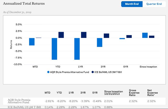 在经历了2018年的艰难一年之后,该公司的大部分基金都未能盈利,譬如,据AQR官网,其另类风格溢价基金(AQR Style Premia Alternative Fund)去年下跌了8.2%,表现逊于美国3个月期国库券指数。