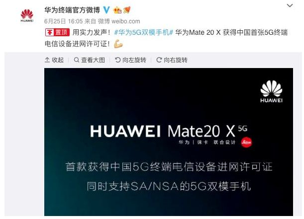2019年7月,就在高通X55还停留在口头宣传上的时候,华为采用“麒麟980+巴龙5000”的方案,发布了自己的第一款5G手机——Mate20 X 5G。 这也是国内第一款获得入网许可证的5G手机。