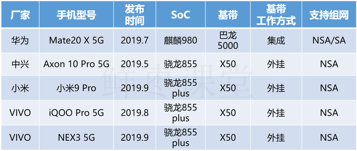 因为高通的X55要等到2020年一季度才能批量出货,所以,当时包括小米、中兴、VIVO在内的一众手机厂商,只能使用外挂X50基带的高通SoC芯片,发布自家5G旗舰。