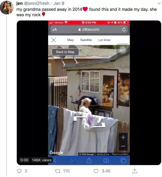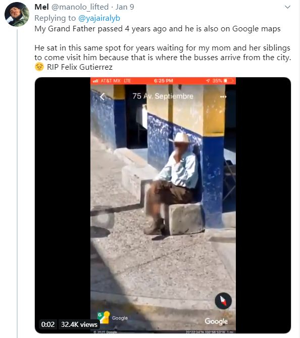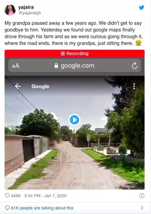 我的爷爷前几年去世了。当时我们没来得及见他最后一面,跟他道别。昨天我们发现谷歌地图街景中有他的农场,当我们好奇地跟着街景一步步往前走时发现,路的尽头是我的爷爷,他就坐在那里。
