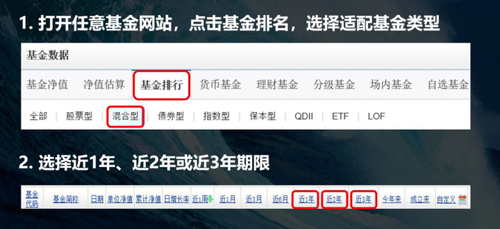 第一步:打开天天基金网“基金排行”页面,分别按照近1年、近2年、近3年的业绩进行排名筛选,记录下排名靠前的20只基金。