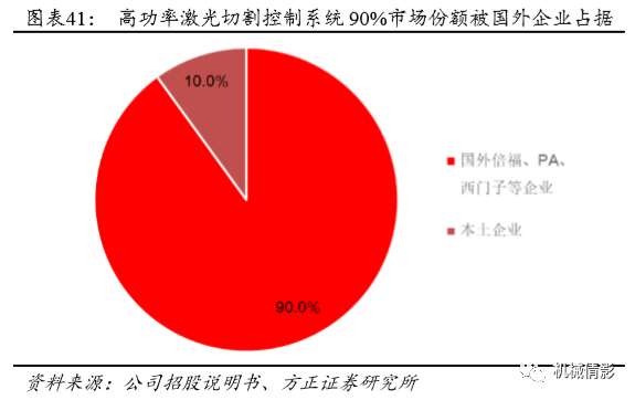 不同于中低功率激光切割设备选择选择板卡形式的控制系统为主,高功率激光切割设备对切割性能的要求相对较高,倾向选择总线控制系统,总线系统开发难度大,且投入成本较高。在高功率激光切割控制系统领域,当前国际厂商依然占据绝对优势,为中国市场主导者,国产激光运动控制系统仅占据约10%的市场份额。实际公司已经在高功率控制系统领域有所布局,并形成了一定规模的销售,而10%的市场份额也近乎为公司所占据,看好公司在此领域的发展前景(在下文4.1章节作详细探讨)。