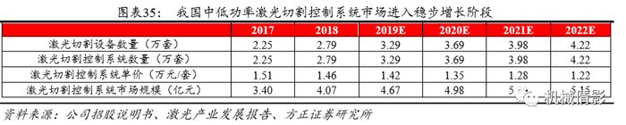 根据《激光行业研究报告》,中低功率激光切割设备配套运动控制系统未来的需求量呈现上升趋势、单价呈现小幅下降趋势,预计2019-2022年中低功率激光切割控制系统对应市场规模4.67、4.98、5.09和5.15亿元,2020-2022三年合计市场规模超过15亿元,总体市场空间保持稳步增长。