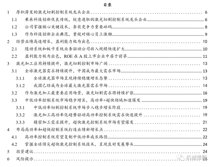 核心观点:作为厚积薄发的激光切割控制系统龙头企业,公司秉承科技创新的优良传统,借助激励到位的技术团队优势,引领激光切割控制系统进口替代。在实现社会价值同时,公司经营业绩得到了快速发展,盈利能力出色。我国激光切割控制系统市场广阔,在巩固中低功率激光切割系统市场绝对领先地位时,公司加速布局高功率和超快加工控制系统,我们判断公司具备持续高速成长的潜质。首次覆盖,给予“推荐”投资评级。