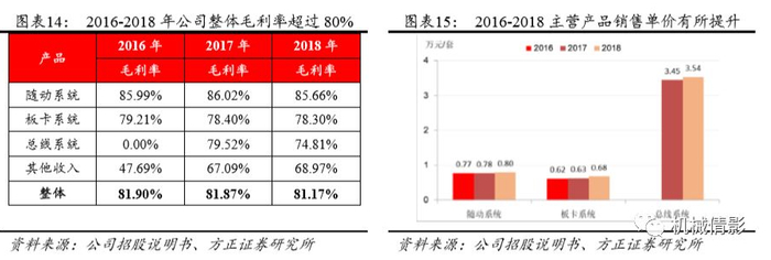 下游客户的持续突破直接带动公司主营产品销量快速提升,占营收比重较大的板卡系统、随动系统2016年销量为8419和8555套,到2018年提升到了15292和15047套,过去三年复合增速分别高达35%和33%,发展势头迅猛。