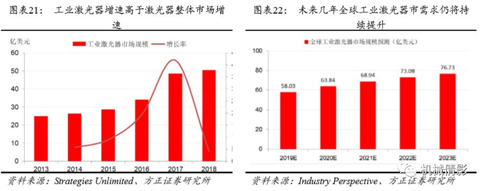 从产品分类来看,随着全球工业自动化生产的推进和激光器功率的提升,激光器在工业领域的应用快速渗透,最终导致在激光器市场内部呈现工业激光器领跑激光器行业整体的局面,成为全球激光器市场增长的最大动力。根据IndustryPerspective的数据,预计2019-2023 年全球工业激光器年均复合增长率超过7%,2023年整体市场规模可达76.73亿美元。