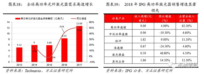 同样以光纤激光器为例,全球光纤激光器呈现功率持续提升的发展趋势。①数据显示,2016年和2017年全球高功率光纤激光器销售额分别为8.33和12.68亿美元,增速均超过40%,高于光纤激光器整体需求增速。②从龙头企业IPG的销售结构上看,公司2018年高功率连续激光器销售额9.09亿美元,占公司营业收入比重高达62.30%,高功率激光器成为最重要收入构成。此外,在2018年中国激光行业增速放缓情况下,IPG高功率激光销售增速高于中低功率连续光纤激光器,足以说明光纤激光器朝着高功率的趋势发展。