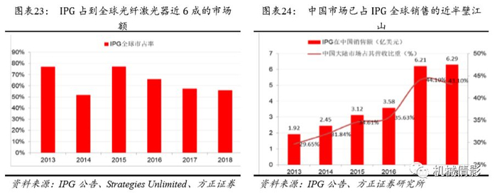 在没有中国市场统计数据的情况下,以2018年在全球光纤激光市占率近56%的IPG作为映射,其在中国市场的业务大致可以表征中国大陆地区对光纤激光器需求量。IPG2018年在中国大陆等销售额高达6.29亿美元,占据其全球销售规模的43.10%,中国大陆市场在IPG业务中的重要地位,可以侧面反映国内市场对光纤激光器的巨大需求。