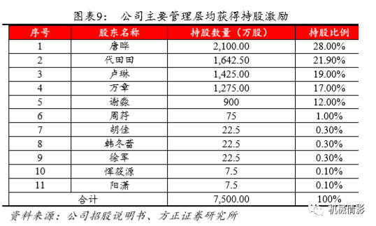 作为一家科技创新型企业典范,公司十分重视对核心管理、技术人员的激励。①唐晔、代田田、卢琳、万章和谢淼作为公司的控股股东和实际控制人,分别直接持有28.00%、21.90%、19.00%、17.00%、12.00%的股份。②2018年为进一步提高员工的积极性,公司实施了股权激励,重要管理人员以及核心技术人员胡佳、韩冬蕾、徐军、恽筱源和阳潇5名员工获得持股。