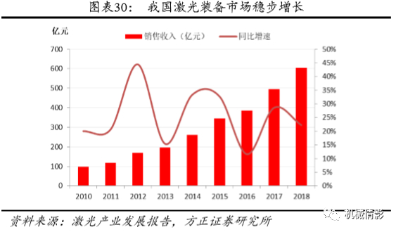 根据中国激光产业发展报告,2010-2018年我国激光装备销售收入始终维持在两位数的增速,2017年我国激光设备收入已达495亿元,同比增速为29%,2018年在下半年需求放缓的不利局面下,全年市场销售总额仍然到达605亿元,同比增长22%。
