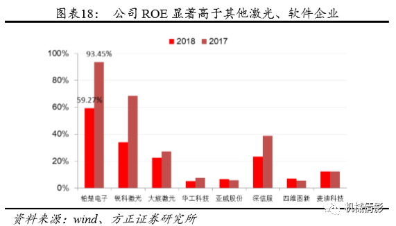 实际上,作为科技创造价值的典范,公司如此出色的净利率水平,在制造业中极为少见,从股东回报角度看,在A股上市公司中居于前列。①公司2017和2018 年净资产收益率ROE 为93%和59%,显著高于同行的激光、软件企业。②即使在所有A 股(除 ST)三千多家上市公司中,2017和2018年公司的ROE排名也高居第4和第10。